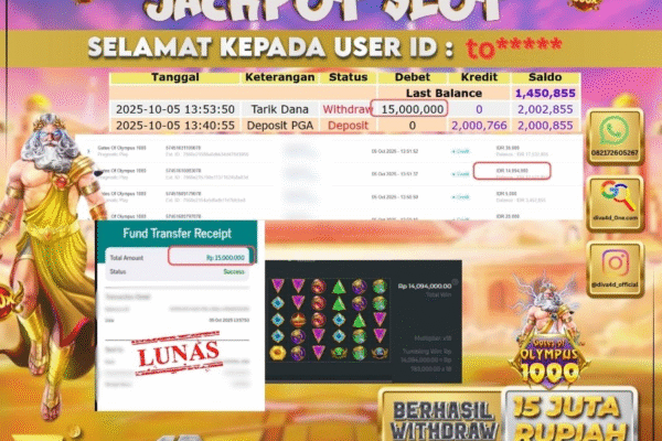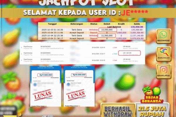 elamat kepada User id : ****** Telah berhasil mendapatkan kemenangan besar pada permainan TOGEL kemenangan Sebesar Rp.10.400.000, Setelah mengisi formulir withdraw dengan kurung waktu hanya 5 – 10 menit pihak diva4dsudah melakukan transfer kepada pemilik Userid dan dana sudah dapat di cairkan oleh pemenang. Bukti pembayaran yang kami berikan merupakan bukti pembayaran yang SAH / VALID yang langung di dapatkan melaui tanda transfer transaksi…