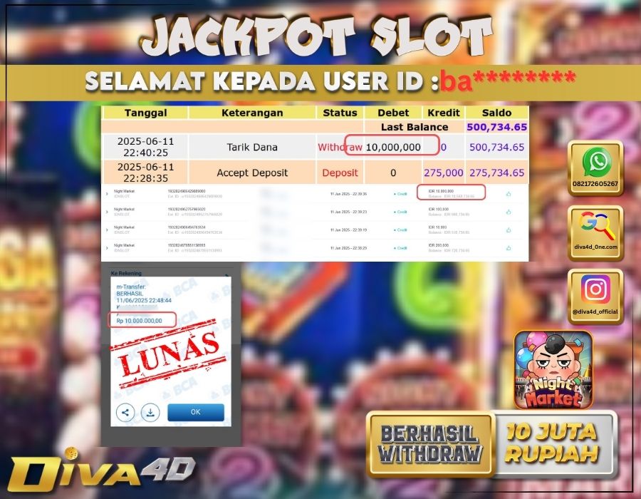 Selamat kepada User id : BA*** Telah berhasil mendapatkan kemenangan besar pada permainan SLOT NIGHT MARKET kemenangan Sebesar Rp.10.000.000, Setelah mengisi formulir withdraw dengan kurung waktu hanya 5 – 10 menit pihak diva4dsudah melakukan transfer kepada pemilik Userid dan dana sudah dapat di cairkan oleh pemenang. Bukti pembayaran yang kami berikan merupakan bukti pembayaran yang SAH / VALID yang langung di dapatkan melaui tanda transfer transaksi dari Bank yang di tuju.