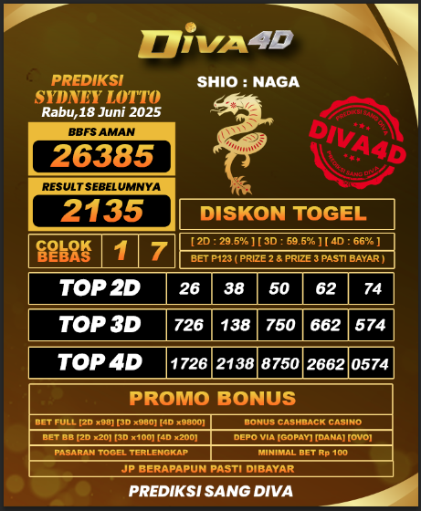 DIVA4D PREDIKSI SDYNEY LOTTO TOGEL HARI: 18 Juni 2025