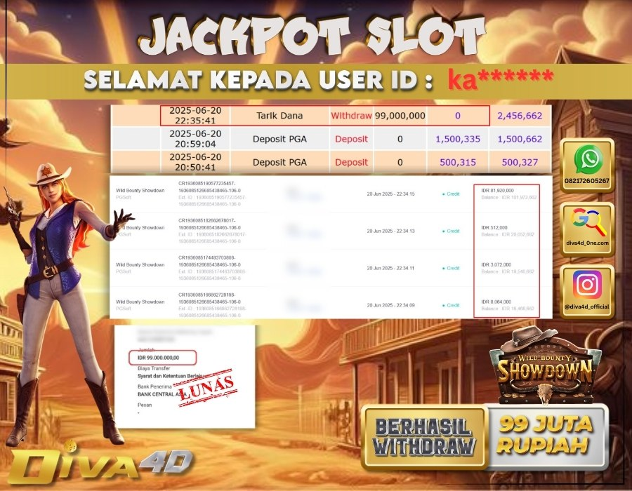 Selamat kepada User id : KA***** Telah berhasil mendapatkan kemenangan besar pada permainan SLOT WILD BOUNTY SHOWDOWN kemenangan Sebesar Rp.99.000.000, Setelah mengisi formulir withdraw dengan kurung waktu hanya 5 – 10 menit pihak diva4dsudah melakukan transfer kepada pemilik Userid dan dana sudah dapat di cairkan oleh pemenang. Bukti pembayaran yang kami berikan merupakan bukti pembayaran yang SAH / VALID yang langung di dapatkan melaui tanda transfer transaksi dari Bank yang di tuju.