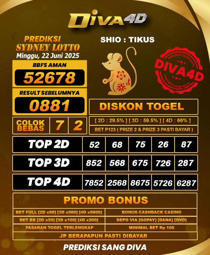 DIVA4D PREDIKSI SDYNEY LOTTO TOGEL HARI: 22 Juni 2025
