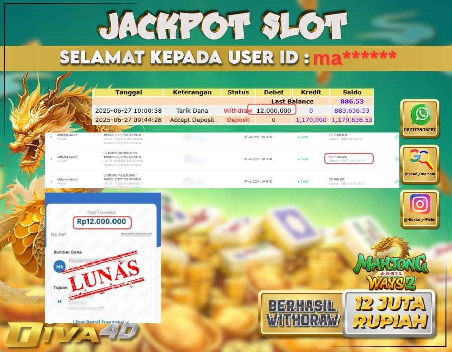 Selamat kepada User id : MA***** Telah berhasil mendapatkan kemenangan besar pada permainan SLOT MAHJONG WAYS 2 kemenangan Sebesar Rp.12.000.000, Setelah mengisi formulir withdraw dengan kurung waktu hanya 5 – 10 menit pihak diva4dsudah melakukan transfer kepada pemilik Userid dan dana sudah dapat di cairkan oleh pemenang. Bukti pembayaran yang kami berikan merupakan bukti pembayaran yang SAH / VALID yang langung di dapatkan melaui tanda transfer transaksi dari Bank yang di tuju.