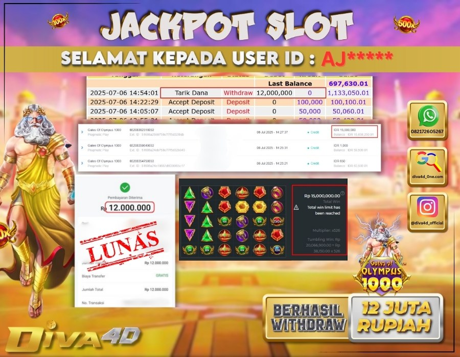 Selamat kepada User id : AJ***** Telah berhasil mendapatkan kemenangan besar pada permainan SLOT GATES OF OLYMPUS 1000 kemenangan Sebesar Rp.12.000.000, Setelah mengisi formulir withdraw dengan kurung waktu hanya 5 – 10 menit pihak diva4dsudah melakukan transfer kepada pemilik Userid dan dana sudah dapat di cairkan oleh pemenang. Bukti pembayaran yang kami berikan merupakan bukti pembayaran yang SAH / VALID yang langung di dapatkan melaui tanda transfer transaksi dari Bank yang di tuju.