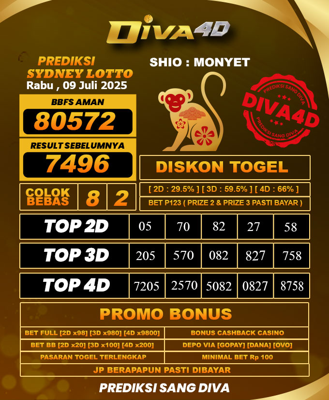 DIVA4D PREDIKSI SDYNEY LOTTO TOGEL HARI: 09 Juli 2025