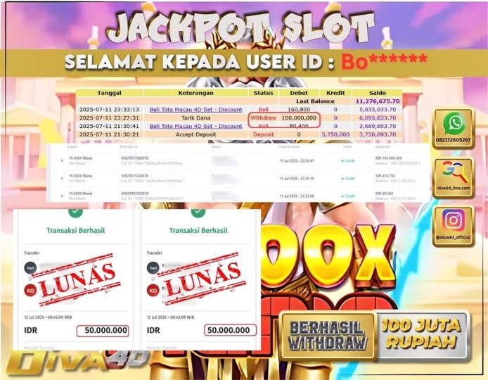 Selamat kepada User id : BO***** Telah berhasil mendapatkan kemenangan besar pada permainan SLOT GATES OF OLYMPUS 1000 kemenangan Sebesar Rp.100.000.000, Setelah mengisi formulir withdraw dengan kurung waktu hanya 5 – 10 menit pihak diva4dsudah melakukan transfer kepada pemilik Userid dan dana sudah dapat di cairkan oleh pemenang. Bukti pembayaran yang kami berikan merupakan bukti pembayaran yang SAH / VALID yang langung di dapatkan melaui tanda transfer transaksi dari Bank yang di tuju.