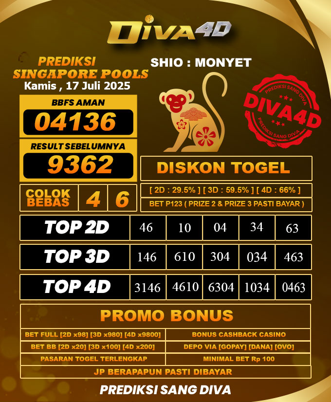 DIVA4D PREDIKSI SINGAPORE POOLS TOGEL HARI: 17 Juli 2025