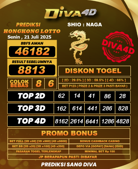 DIVA4D PREDIKSI HONGKONG LOTTO TOGEL HARI: 21 Juli 2025