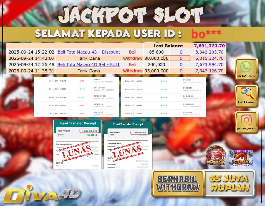 Selamat kepada User id : BO***** Telah berhasil mendapatkan kemenangan besar pada permainan SLOT OI GATE kemenangan Sebesar Rp.65.000.000, Setelah mengisi formulir withdraw dengan kurung waktu hanya 5 – 10 menit pihak diva4dsudah melakukan transfer kepada pemilik Userid dan dana sudah dapat di cairkan oleh pemenang. Bukti pembayaran yang kami berikan merupakan bukti pembayaran yang SAH / VALID yang langung di dapatkan melaui tanda transfer transaksi dari Bank yang di tuju.