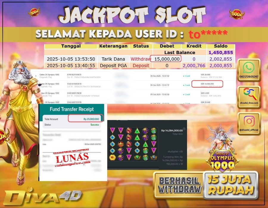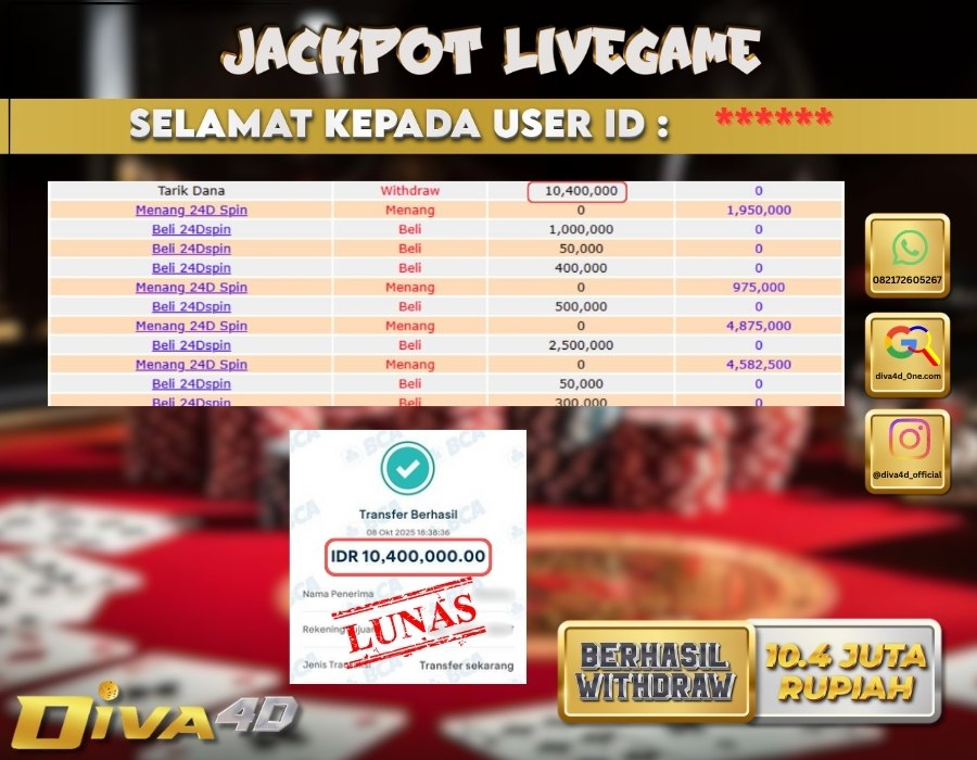 elamat kepada User id : ****** Telah berhasil mendapatkan kemenangan besar pada permainan TOGEL kemenangan Sebesar Rp.10.400.000, Setelah mengisi formulir withdraw dengan kurung waktu hanya 5 – 10 menit pihak diva4dsudah melakukan transfer kepada pemilik Userid dan dana sudah dapat di cairkan oleh pemenang. Bukti pembayaran yang kami berikan merupakan bukti pembayaran yang SAH / VALID yang langung di dapatkan melaui tanda transfer transaksi dari Bank yang di tuju.